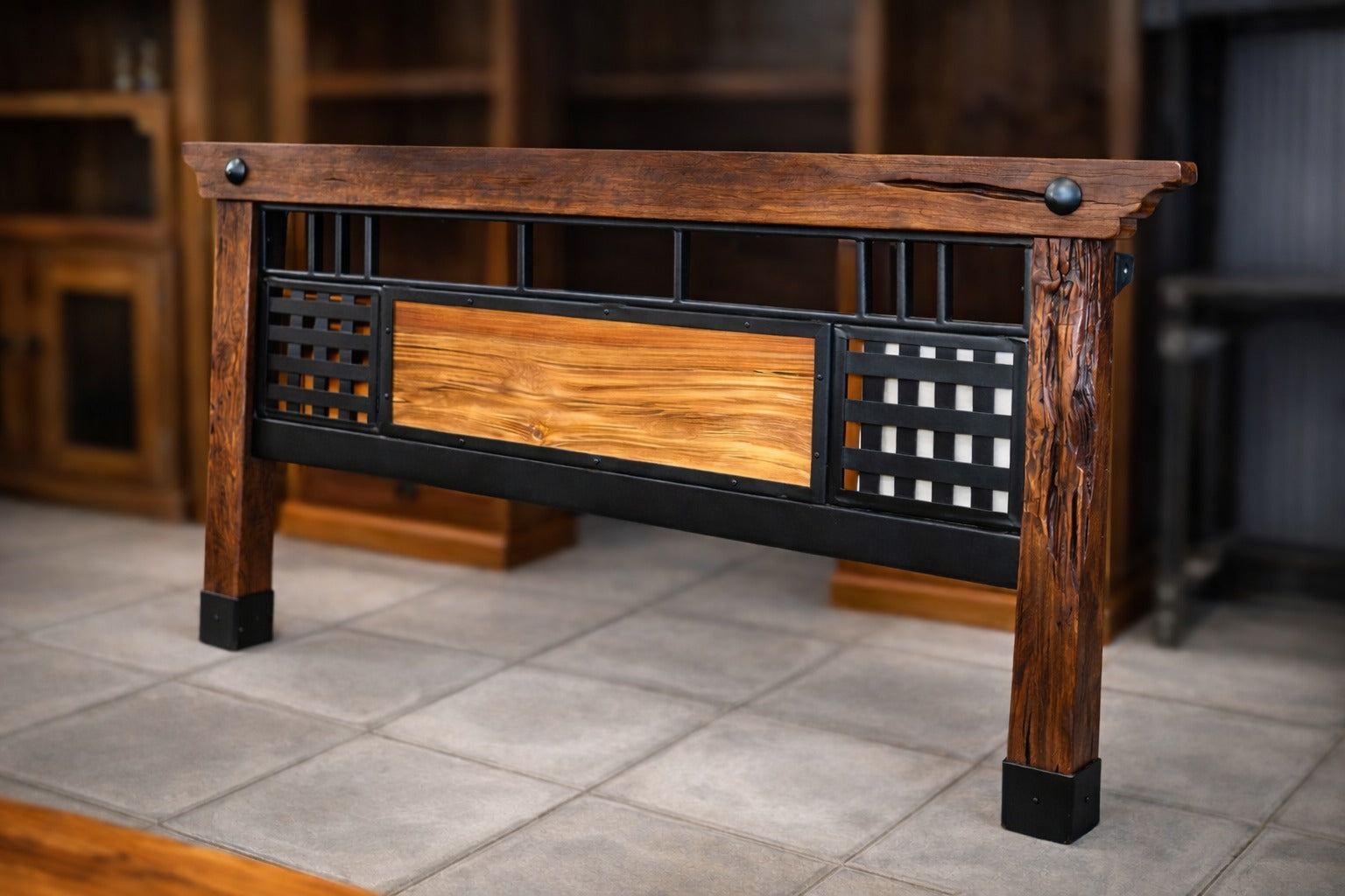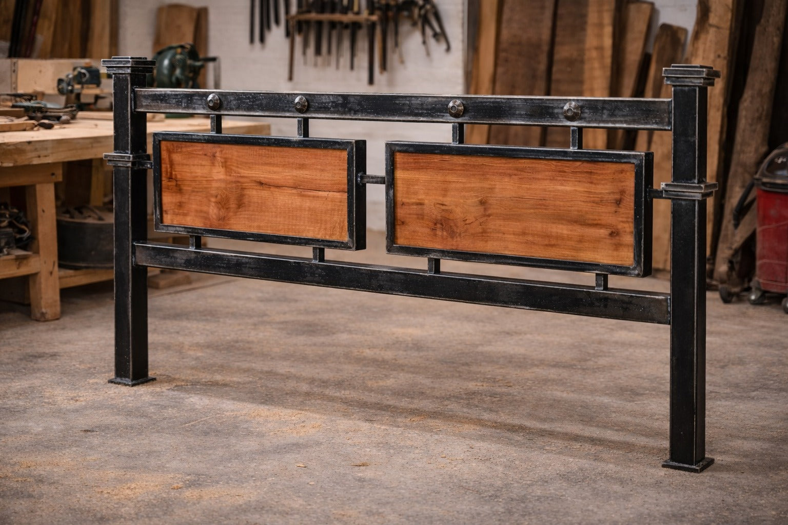Este respaldo de cama combina la firmeza del fierro con la calidez y nobleza de la madera de roble, logrando una pieza sólida, elegante y con carácter 🪵🖤. La fusión de materiales aporta equilibrio entre lo industrial y lo natural, adaptándose a distintos estilos decorativos.