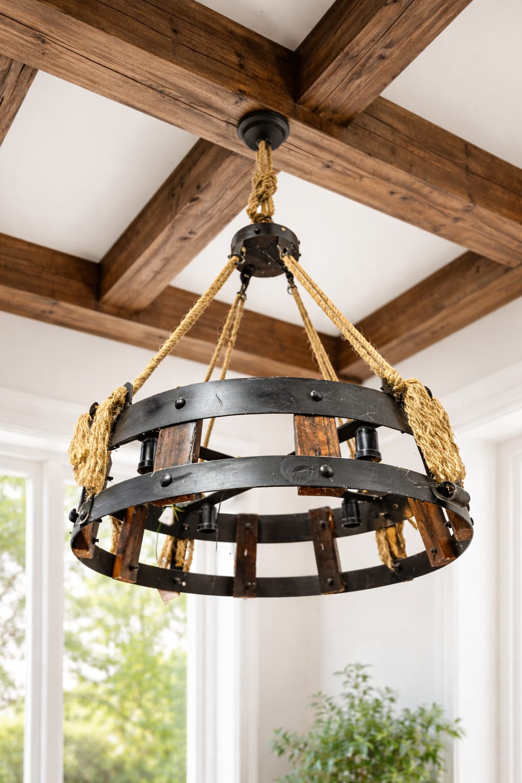 Fabricada en fierro y duelas de barrica recicladas, esta lámpara colgante de 4 luces combina carácter, diseño y conciencia ecológica ♻️🪵. Cada pieza conserva la esencia y textura original de la madera, creando un ambiente cálido y acogedor.